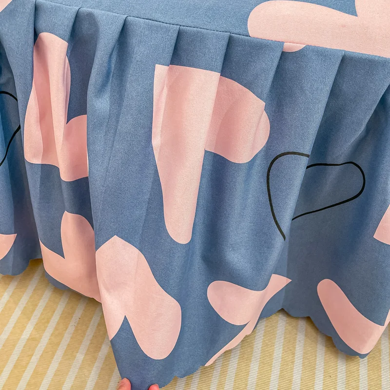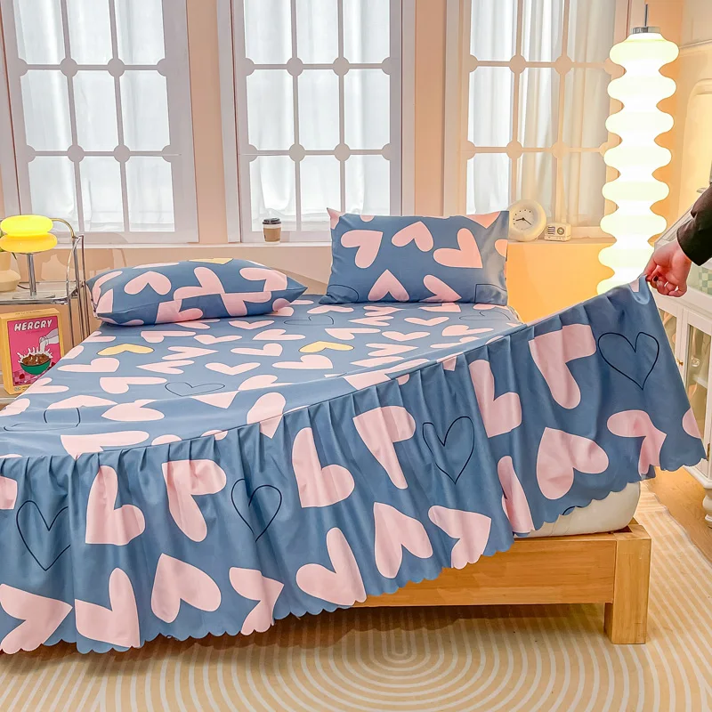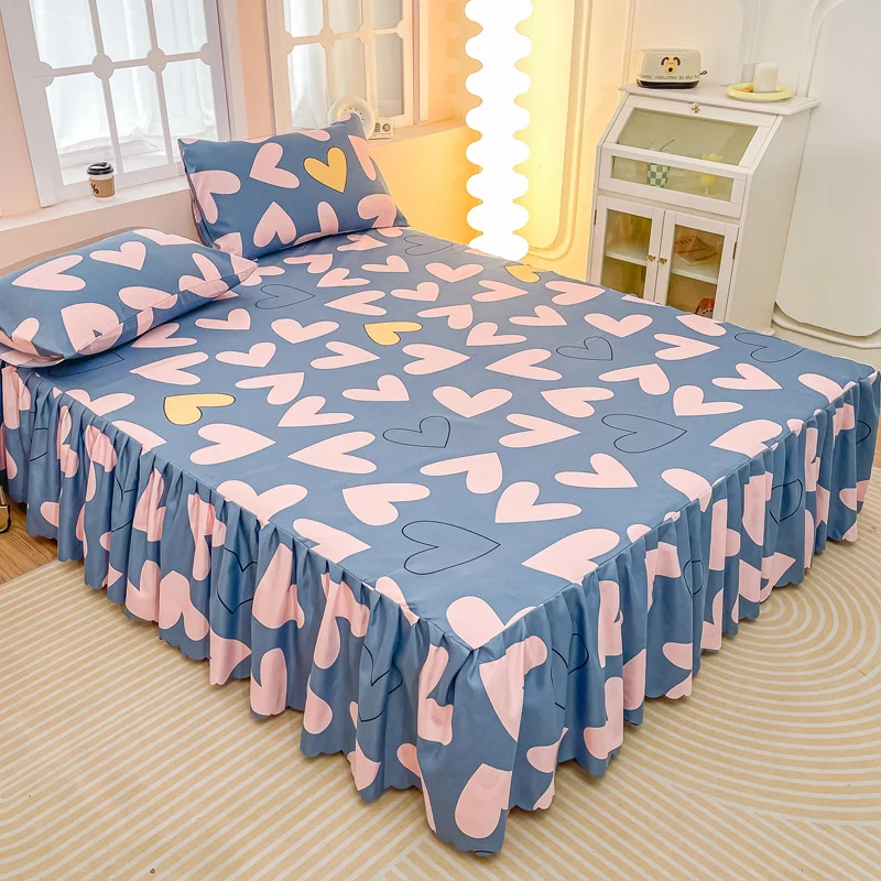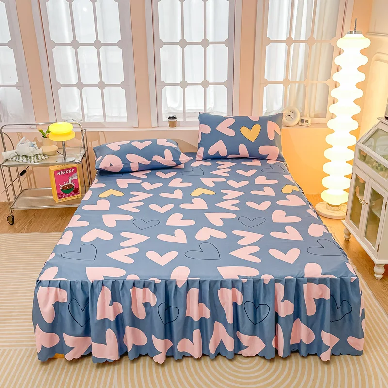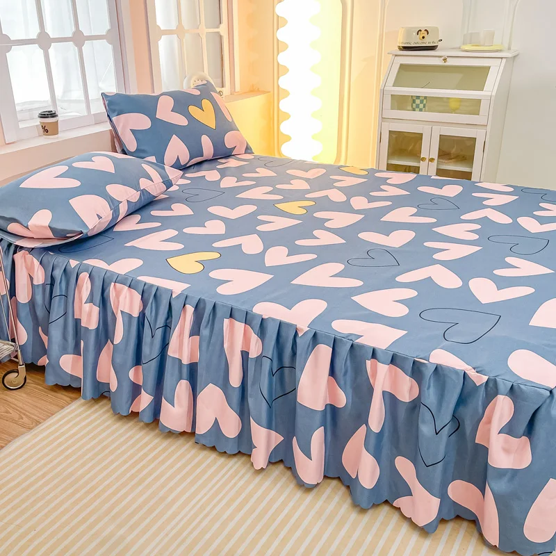 Parure de lit 3 pièces Coeur rose et bleu, jupe élastique couvre-lit et couvre-oreillers